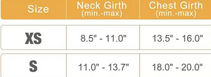 Size XS: Fits pets with a neck girth between 8.5 and 11 inches and a chest girth between 13.5 and 16 inches.